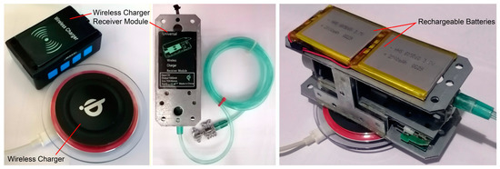 Figure 7 presents the wireless power charging system of the device. In the wireless control unit, a wireless module, an LCD, a power management module, and a microcontroller are used. According to the specifications of the mentioned components, the wireless control unit has a power consumption of 185 mAh. In this unit, two HHS503450 lithium-polymer rechargeable batteries are connected in a series configuration, to supply the unit with a total capacity of 7.4 W. Therefore, this the battery cell is capable of supplying the wireless control unit for 8 h before the need of a recharge.