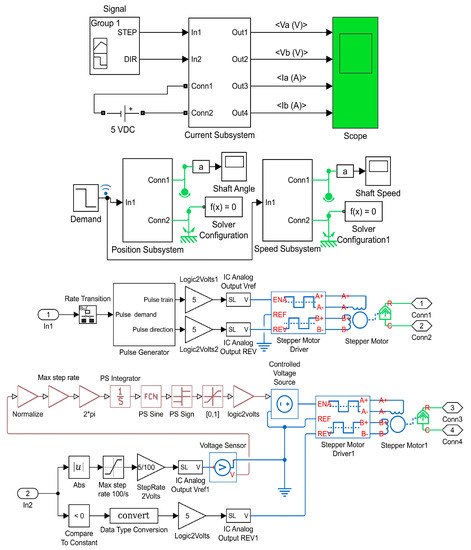 The control system of the hybrid distractor should be capable of controlling and driving the implemented hybrid stepper motor. For this purpose, a high-precision linear control technique [24,25] is used in the design of the control system. By using the differential equations of the stepper motor [26], as well as the specifications of the hybrid stepper motor, the control system was modelled in MATLAB/SIMULINK software. Figure 8 presents the modelled control system.