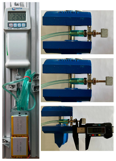 In the second phase of the experimental study, the device was fixed while working under different conditions, to evaluate the performance of the device in terms of accurate positioning and to execute a standard distraction process, with the desired working factors. In this experiment, an RS PRO digital calliper, with a resolution and precision of 0.01 mm, was used, for the measurement of the total travel of the end effector. Figure 9 presents the condition of the linear positioning test. According to the literature, as well as the results of performed experimental studies, it can be deduced that in a standard DO process using ACDO devices, the following parameters are usually used: DR: 1–3 mm/day. Distraction length: 10–30 mm. DF: 20–35 N. Treatment period: 7–10 days [5,7,13]. Therefore, in the experimental study, different DO processes were performed using various working parameters, to evaluate the performance of the device under different treatment conditions. Table 1 presents the set working parameters used in the experimental tests.