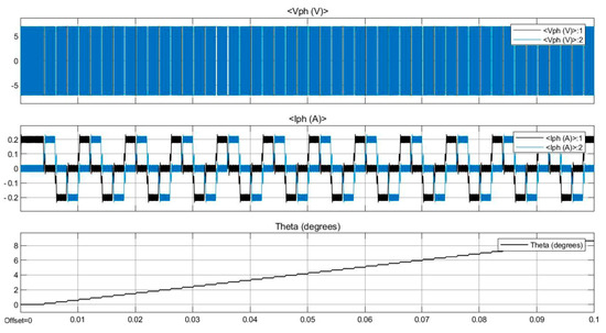 The control system can generate control signals and drive the stepper motor of the linear mechanism using an open-loop control system. Simulation of the modelled control system was run for 0.1 s and graphical results were produced. The simulation results, including four waveforms, are presented in Figure 10, where, V1 and V2 are the voltages in the stepper motor phases, I1 and I2 are the currents in the stepper motor phases, and theta is the shaft position of the stepper motor. It can be seen that the voltage and current waveforms in phase A and B are 90° displaced, and agree with theoretical equations. In addition, the shaft angle and shaft speed waveforms show that the stepper motor can execute a soft rotation with low noise and ripple. The positioning of the rotor as well as the rotor speed are well controlled. The simulation results show that the control system can drive the stepper motor with the desired working factors. It can be deduced from the simulation results that the designed control system used in this device, work well in different conditions. Driving the stepper motor in micro-stepping drive mode could provide a smooth and controlled rotation of the motor shaft, which secures a smooth and continuous force generation.
