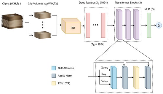 Compared to other methods employing static frames [], here we employ a 3DCNN based on the inflated Inception3D (I3D) architecture []. The aim of the ST module is to capture spatiotemporal features related to fine-grained movements performed during the task. The I3D model was based upon the successful Inception architecture by ‘inflating’ the 2D convolutional layers to a new axis that represents the temporal dimension. The original I3D considers two input sources: optical flow and RGB. In this work, the I3D was pretrained on the Kinetics dataset using as input modality only the RGB (https://github.com/dlpbc/keras-kinetics-i3d. Accessed on 20 September 2022).