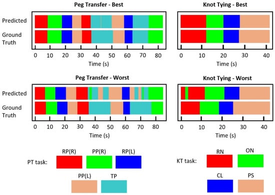 Figure 5 presents the best and worst per-frame predictions using C3DTrans-100 for both surgical tasks, using color-coded ribbons. To obtain the predictions we extracted rolling clips with 1 frame step. The entire processing was performed online, meaning that the prediction for the n-th frame was based on frames [n-14,n]. Although trained for classification, rather than segmentation, the model was able to successfully identify the gesture transitions, indicating its potential for online prediction. It may be also noted that for the PT task, the model seems to slightly confuse PP and TP gestures.