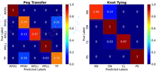 In addition, Figure 5 and Figure 6 provide a more detailed presentation concerning which gestures our model tends to misclassify. Regarding the PT task, the per-frame prediction and confusion matrix show that the model tends to confuse the TP gesture with the PP(L) and PP(R) gestures. These three gestures present similar movement patterns, as all three gestures start with the grasper holding the peg and end with the grasper placing the peg, either on the pegboard or on the other grasper. Regarding the KT task, we notice that the model confuses the RN with the ON gestures. Similar movement patterns may occur during those two gestures.