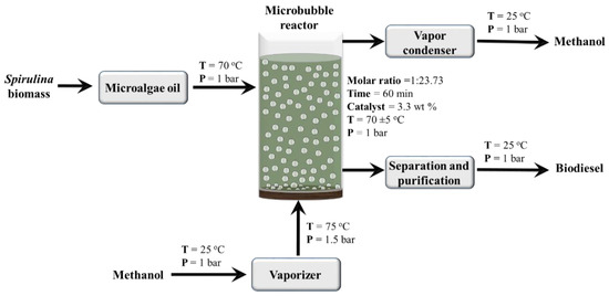 The renewable energy generation is an important factor in reducing harmful effects on the environment caused by the excess use of conventional fuels. Biodiesel derived from inexpensive feedstocks, such as microalgae, can be a suitable alternative for replacing fossil fuel. Biodiesel is generally produced from various resources, such as waste cooking oil, animal fats, energy corps, yeast lipids, and microalgae [1,2]. Biodiesel consists of long chains of carboxylic acids of alkyl ester produced from esterification and transesterification of lipids or oils [3,4].