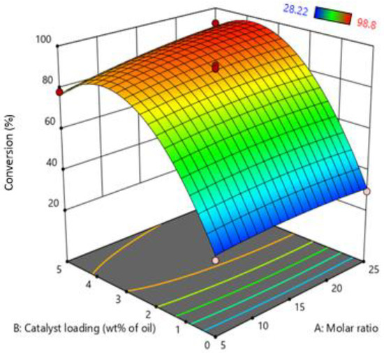 The simultaneous effect of the molar ratio of oil: MeOH and catalyst loading are shown in Figure 3. The graph indicates that increasing catalyst loading from 0 to 5 wt% of MO significantly increases the conversion of the process. Increasing the catalyst loading enhances the protonation of FFA in MO. As the degree of protonation increases, the conversion of FFA and the reaction rate also increases. A further increase in catalyst loading after a certain point conversion of FFA was not increased due to insufficient active sites of MO. Furthermore, Perturbation plot of RSM indicate that most dominate factor in the current study is catalyst loading as show in Figure S-II.