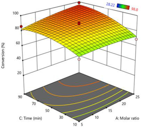 The effect of both time and molar ratio was investigated and are shown in Figure 4. Time is another important parameter to study the rate of reaction. The results indicate that increasing time conversion and the rate of reaction increase due to an increase in reaction time increases the contact time of oil molecules with MeOH. As a result, conversion of FFA increases. However, a higher molar ratio and less reaction time decrease the reaction rate due to the bubble having less contact time with MeOH, as the flowrate of MeOH vapors is too high. As a result, the result MeOH vapors leave the system unreacted [18,20,23].