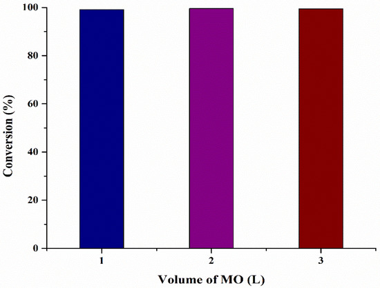 The main goal of this work is to investigate the scale-up capacity of microbubble technology at optimized conditions provided by RSM and GRU and verify that provided conditions are suitable for converting FFA into biodiesel. For scale-up of microbubble reactor, different experiments were performed at different volumes of reactor varying from 1 to 3 L (Conversion: 1 L = 99.12%, 2 L = 99.55%, 3 L = 99.45%), as shown in Figure 6. It was observed that an increase in the volume in the reactor has negligible effect on the FFA conversion. An increase in the volume of oil also increased the pressure head of the microbubble reactor. By increasing the volume of oil, microbubbles stay in contact with the oil for a longer period of time. However, it is observed that an equilibrium is achieved at 200 mm and does not change if it is increased any further. This could be explained on the basis of mass transfer occurring across the bubble interface and kinetics of the reaction. At 200 mm, a boundary layer would have formed at the bubble interface stopping the mass transfer of MeOH from inside the bubble to the oil working as a “solid sphere”. Several studies in hot microbubble distillation/stripping show that increasing the liquid layer heat can decrease separation efficiency because the non-equilibrium driving force diminishes [39]. Thus, further upscaling of the reactor should be horizontal by maintaining the microbubble tessellation pattern in the reactor. However, this scaling approach maintains the local mixing profile, which is the major uncontrolled variable in conventional stirred tank reactor upscaling.