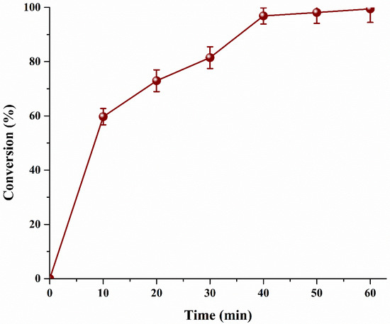 The kinetics of this study were investigated under optimized condition of RSM, i.e., the molar ratio of MO to MeOH of 1:23.73 ratio, time of 60 min, and a catalyst loading of 3.3 wt% MO. The results show that the difference between predicted value of RSM (99.10% as shown in Figure S-I) and actual value (99.45%) was less than 0.5% which indicate the validation of the current RSM model. To evaluate the reaction behavior of vapor–liquid, Ha was calculated using Equation (8) to assess the whether a reaction occurs on the bubble’s bulk or surface [43,44].