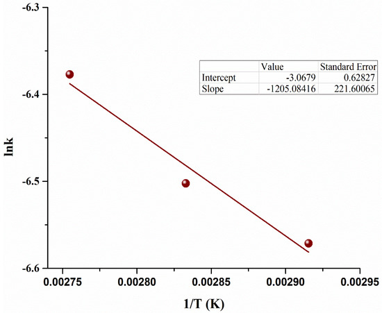 To determine the current activation energy (EA) in the scale-up reactor, the Arrhenius equation was used. The experiments were conducted by varying the reaction temperature (70–90 °C) [43]. The Arrhenius equation was used to develop the relations with rate constants to develop the equation to determine EA using Equation (16) [47]. An Arrhenius plot between ln (k) and 1/T is shown in Figure 8.