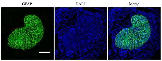 Fluorescent images were captured using a confocal microscope in three channels, namely the GFAP channel in which the glial LC beams were stained green, the DAPI channel in which the cell nucleus was blue, and the merged image. Scale bar: 100 μm.