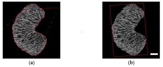 The boundary (a) and the minimum external rectangle (b) of the ONH were marked red automatically on the grayscale image. Scale bar: 50 μm.