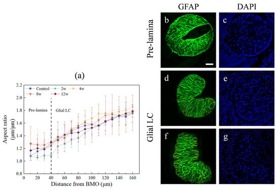 The ONH was sectioned from the Bruch’s membrane opening (BMO) and was divided into two regions: the pre-laminar region and the glial LC region []. According to the aspect ratio results (Figure 4a), the pre-laminar region was defined by a distance of 0 to 40 μm from the BMO, and the morphology of the ONH was closest to the circle type (Figure 4b,c). The other region was defined as the glial LC region, which was defined by a distance of 40 to 160 μm from the BMO (Figure 4d–g).