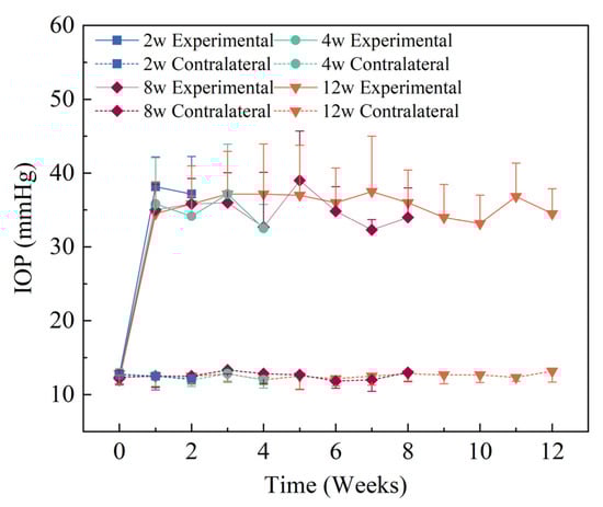 IOPs of both eyes were measured when the rats were awake before the experiment. Normal IOPs were about 12.50 ± 0.29 mmHg, and the values were similar in both eyes (p > 0.05). IOPs of experimental eyes increased after the chronic high-IOP model was induced, and the high IOP level was sustained until 12 w. The contralateral control eyes maintained normal IOP, indicating that the method of inducing the model did not affect the IOP level of the contralateral eyes in this study (Figure 5).