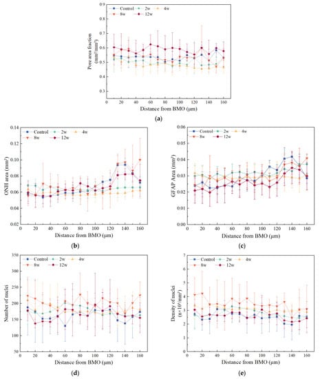 The pore area fraction decreased gradually along the axial direction of ON, and it was significantly higher in the pre-laminar region than in the region behind at 4 w (p < 0.01) and 8 w (p < 0.05, Figure 7a). The ONH area gradually increased after 120 μm from BMO except at 2 w and 4 w (Figure 7b). Similarly, the GFAP area also increased after 120 μm from BMO except at 4 w (Figure 7c). In addition, there was no clear trend of change in the number and density of nuclei along the ON (Figure 7d,e).