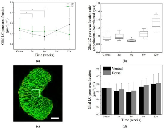In this study, all sections along the ON were separated into two regions based on the aspect ratio, namely the pre-laminar and glial LC regions. Then all features were averaged from sections in the glial LC region. Pore area fraction within the glial LC region decreased at 2 w and 4 w after model induction (p < 0.01) and then increased at 12 w (p < 0.01), compared to the control group (Figure 8a). The processed images (Figure 6f–j) could confirm that the fibers seemed denser at 2 w and 4 w, while disorganized fibers and blurred GFAP staining along with abnormal tissue gaps appeared at 12 w, which might cause the increase in glial LC pore area fraction. As for the contralateral control eyes, there was no significant difference between groups (p > 0.05, Figure 8a). Compared to the contralateral control eyes, the glial LC pore area fraction of experimental eyes decreased at 4 w and then increased at 12 w significantly (p < 0.01, Figure 8b). Two 50 × 50 μm areas were selected from similar positions in both ventral and dorsal regions of glial LC (red and white boxes in Figure 8c) in each section. The glial LC pore area fraction of the selected region was then averaged in the glial LC region of six rats in each group. It was found that there was no significant difference in glial LC pore area fraction between the dorsal surface and the ventral surface (p > 0.05). The glial LC pore area fraction decreased at 2 w and 4 w and then increased until 12 w in both dorsal and ventral regions with continuous high IOP (Figure 8d).