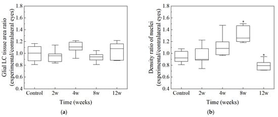 The ONH area, GFAP area, number of nuclei, and density of nuclei within the glial LC region, as previously defined by a distance of 40 to 160 μm from the BMO, were counted and calculated automatically. The name of the ONH region within the glial LC region was simplified as the glial LC tissue region. These features within the glial LC region from six rats in each group were averaged (Table 1). The number of nuclei in the glial LC region increased at 8 w of high IOP (p > 0.05) and then decreased significantly (p < 0.05, vs. 8 w experimental group). The nucleus density increased with the duration of high IOP, reaching a maximum at 8 w (p < 0.05), and then decreased at 12 w (p < 0.05, vs. 8 w experimental group). The glial LC tissue area decreased until 4 w (p > 0.05) and then increased at 8 w (p > 0.05). There was no significant difference in GFAP area between groups (p > 0.05). Compared to contralateral control eyes, there was no significant difference in the glial LC tissue area in four experimental groups (p > 0.05, Figure 9a). However, the density of nuclei in the glial LC region of experimental eyes increased at 8 w (p < 0.01) and then declined at 12 w (p < 0.01) compared to contralateral control eyes (Figure 9b).