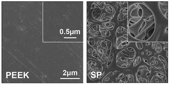 Surface morphology of PEEK and sulfonated PEEK (SP) detected by SEM. Reprinted with permission from Ref. []. Copyright 2022, Elsevier.