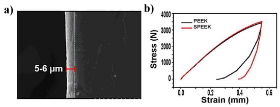 (a) Thickness of the sulfonation layer (5–6 μm). (b) Stress–strain curve for PEEK and SPEEK. Reprinted with permission from Ref. []. Copyright 2022, Elsevier.