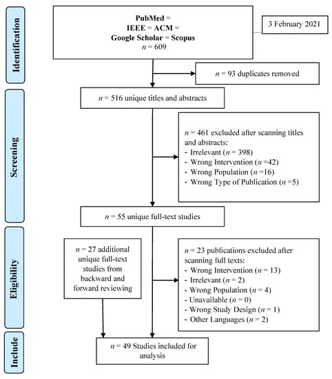 | Performance measures | The metrics to be measured are accuracy, sensitivity (recall), specificity, or AUC. | Any other measures that are not mentioned in the inclusion criteria |