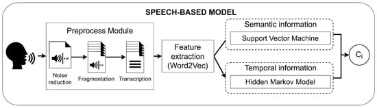 The audio and image channels are separated using FFmpeg (FFmpeg, Sofia, Bucharest). The speech signals are preprocessed to be divided into fragments and automatically transcribed into text using Google transcriber (Figure 2). Next, text data is transformed into feature vectors using Word2Vec. Word2Vec is a neural network which predicts the context of the word, and returns a feature vector representing said context [29,30]. Finally, the obtained features are passed through a model which combines the semantic information obtained from Support Vector Machines (SVM) with the temporal information obtained from Hidden Markov Models (HMM). In a previous study, the model obtained an average accuracy of 80.7%. Further information on the architecture and training approach of the speech-based model can be found in [24].