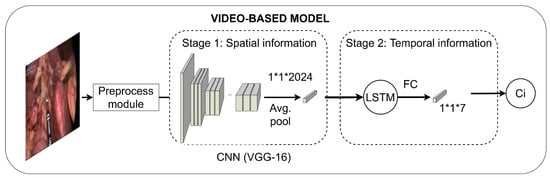 The endoscopic video is classified by means of a Convolutional Neural Network (CNN) with a Long Short-Term Memory (LSTM) unit (Figure 3). Specifically, the CNN is trained using a two-stage approach based on VGG-16 pretrained on ImageNet [31]. The hyperparameters were selected through a 21-fold cross-validation study in which a whole video from the training subset was left out for validation in each fold.