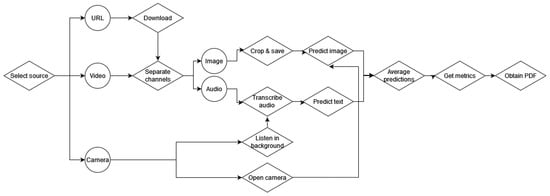 The implemented intelligent system consists of a desktop application capable of obtaining audiovisual information, processing it accordingly, predicting the corresponding phase of the procedure, and obtaining a set of metrics related to procedural skills. Figure 4 depicts the flowchart of the application.