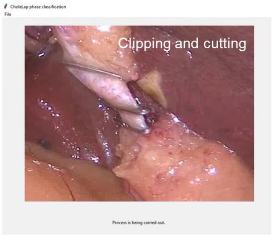 If the URL is selected, the video will be downloaded and processed in the same manner as a local video. The local video (or the downloaded video from the URL) is read and the channels (audio and image) are separated. Then, images are cropped and saved locally to be processed by the image model, while audio is transcribed into text to be processed by the speech model. Images and text samples are classified according to their corresponding phase and averaged to obtain the final prediction. This prediction is printed on the screen together with the image corresponding to the video frame (Figure 5).