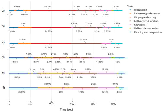 The timeline of phases is especially useful to check whether the procedure was successfully followed. For instance, in the case studied in this work (Figure 6c), we observe that the phases were followed consecutively, except for the packaging phase, where extra cleaning and coagulation was necessary, forcing the surgeon to stop packaging to clean, finish the packaging and clean again to avoid post-surgical complications. The timeline provides a sense of the most time-consuming processes. This could be used, for example, to suggest to the surgeon-in-training the cut off time from a specific phase that could be considered too long.