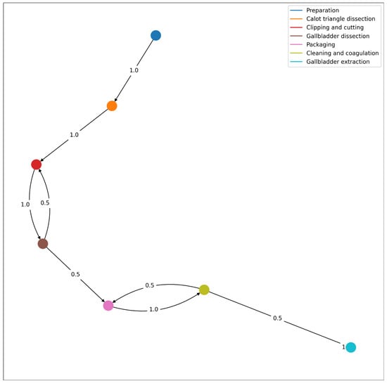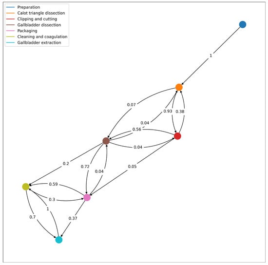 Workflow of the procedure based on the database from the “Surgical Workflow and Skill Analysis” sub-challenge of the Endoscopic Vision Challenge [20], with the corresponding transition probabilities from one phase to another.