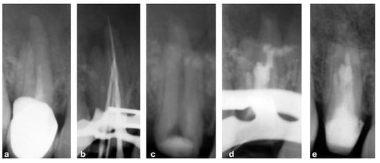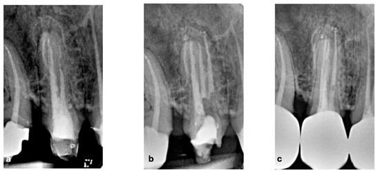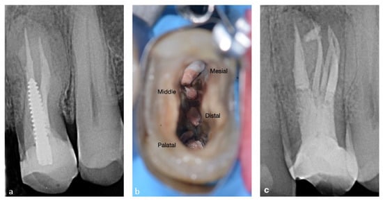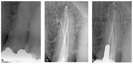 Accurate radiographic examination using horizontal angle variation provides notable support for the endodontist to distinguish the roots and root canals and formulate a correct diagnosis, also in challenging anatomical configurations, as previously reported [,,]. Furthermore, the detection of the pulp chamber anatomy during coronal access and adequate intracanal dentin removal contribute to the correct clinical location of the root canal orifices []. Cone beam-computed tomography (CBCT) is also a diagnostic imaging modality recommended for approaching the complex root canal anatomy [,]. Despite CBCT providing high-quality, accurate, three-dimensional (3D) representations of the anatomical dental structures, the presence of metallic restorations (e.g., amalgam restorations, metal posts and/or crowns) or even gutta-percha can determine significant radiographic artefacts which can impact the visualization of the root canal anatomy and pathological conditions, such as root resorption and root fractures []. Considering that cone beam-computed tomography implies an additional X-ray dose for the patient, the final decision to perform or not to perform a second-level radiologic exam should be based on the clinical and radiographic interpretation of each case. Within this context, the use of a CBCT exam was not considered pivotal for the management of the clinical cases described.