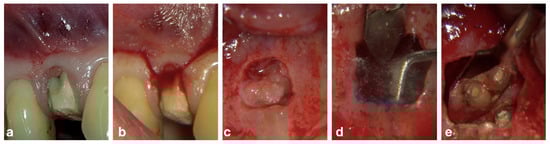 (a) Pre-operative view of the premolar, (b) flap design, (c) intra-operative view of the lesion, (d) ultrasonic tip in action, (e) intra-operative view of the retrograde obturation.