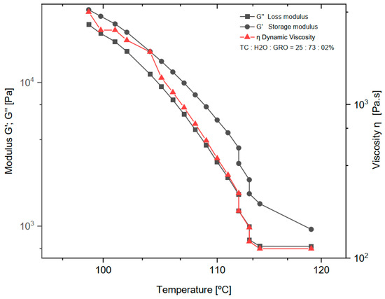 The dynamic rheological experiments were carried out at a fixed frequency of 1 Hz for the mixtures of 25:73:2% of TC:water:glycerine, respectively. The viscoelastic properties were studied by measuring the dynamic viscosity (η), storage modulus (G′), and loss modulus (G″) at a temperature decreasing from 119 to 98 °C with a ramp rate of 2 °C/min (See in Figure 2). Below 98 °C the measurement was no longer possible because the shear forces exceeded the maximum of the sensor installed in the rheometer.
