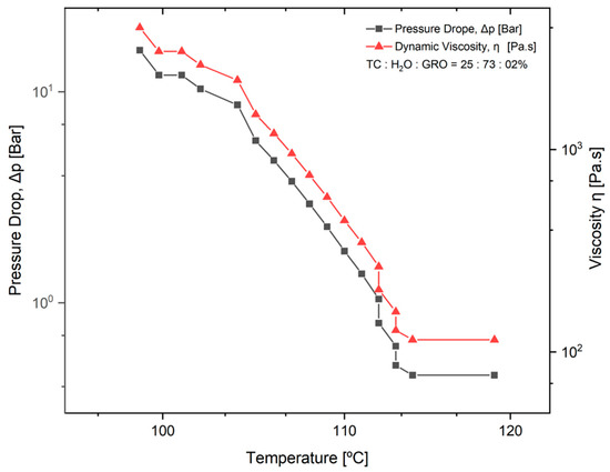 The pressure drop (Δpneedle tip) during extrusion of the TC was determined. This parameter was determined as a function of the dynamic viscosity of the material and a temperature decrease from 119 °C to 98 °C. The mixtures of 25:73:2% of TC:water:glycerine were used. The results can be seen in the diagram in Figure 3. It can be seen that the higher the viscosity of the material, the greater the pressure drop with decreasing temperature. From 100 to 112 °C, an approximately linear progression of the dynamic viscosity can be observed.