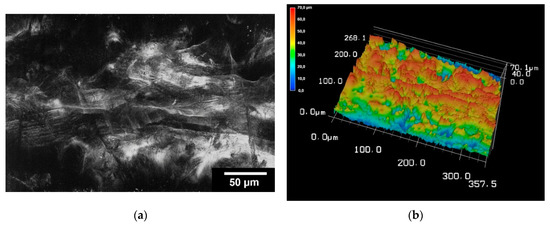 Images of 3D laser scanning of the scaffold surface (a); image of 3D reconstruction of the scaffold surface (b). The images were taken with KEYENCE VK-X210 3D laserscanning microscope; 200× magnification; scale bar = 4 mm.