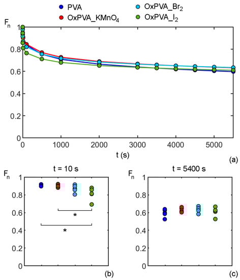 The two chosen times are 10 s (Figure 3b) and 5400 s (Figure 3c) to compare the four groups accounting for, respectively, the first relaxation phase and the asymptotic behavior during the consolidation process. At 10 s, a statistically significant difference was found between PVA and OxPVA_I2 (p-value = 0.038) and between OxPVA_I2 and OxPVA_KMnO4 (p-value = 0.028). At 5400 s, no differences were observed among the four materials: a similar asymptotic behavior was shown by all PVA hydrogels, exhibiting a force reduction of nearly 40% from the initial time instant of the consolidation process.