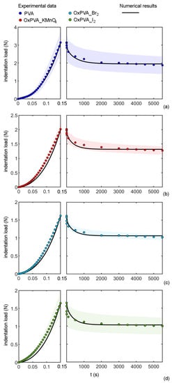 Comparison between experimental data and numerical results of indentation and consolidation tests for native and oxidized PVA hydrogels: indentation load (mean and confidence interval) vs. time for (a) PVA, (b) OxPVA_KMnO4, (c) OxPVA_Br2, and (d) OxPVA_I2.