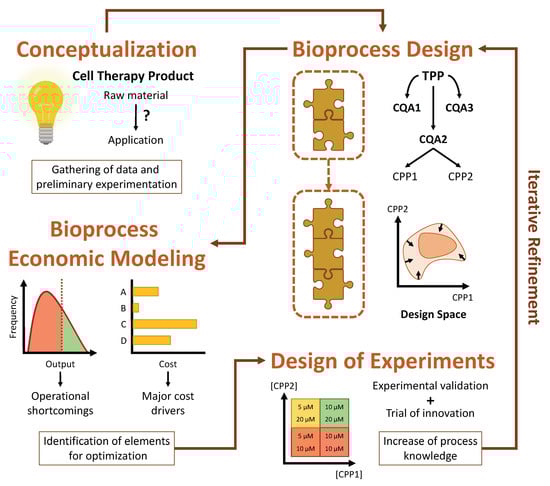 14]. Each one of these steps must adhere rigorously to current good manufacturing practices (cGMP) and be optimized to be economically viable. As such, methodical and carefully planned design approaches are indispensable to successfully developing CTPs [