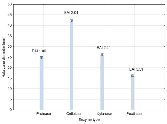 Screening of enzymatic activity of the producing strain Bacillus sp. BioSol021. EAI—enzymatic activity index.