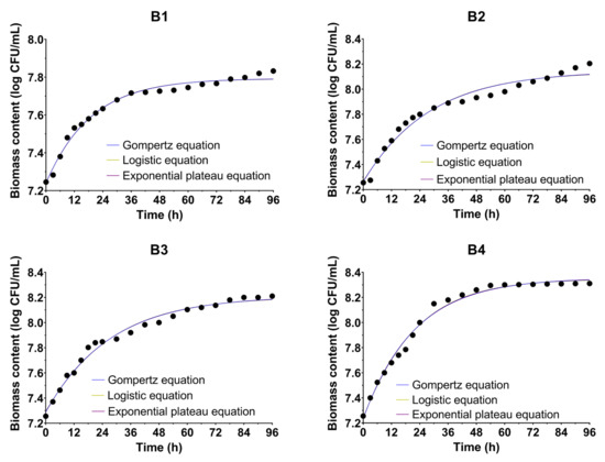 Growth curves of Bacillus sp. BioSol021 under different cultivation conditions fitted using the Gompertz, logistic, and exponential plateau equations. B1: 0.5 vvm, 100 rpm; B2: 0.5 vvm, 300 rpm; B3: 1.5 vvm, 100 rpm; B4: 1.5 vvm, 300 rpm.