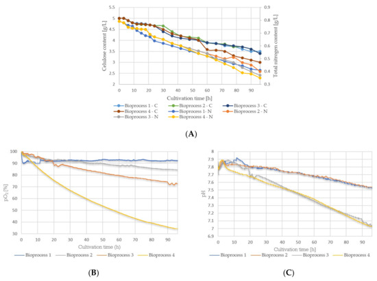Figure 3A indicates the dynamics of the main nutrients’ consumption, including cellulose and total nitrogen. The results pointed out the evident decrease in residual concentrations of the main nutrients during the cultivation, with the highest consumption rate observed in the last experimental set. Figure 3B presents variations of the pH value during the cultivation, indicating a continual decrease in all four cases; however, it expressed the most in the last two experimental sets. Figure 3C shows the trend of oxygen saturation level changes, indicating the significant influence of a higher agitation rate and aeration intensity on the oxygen supply and, consequently, increased oxygen consumption.