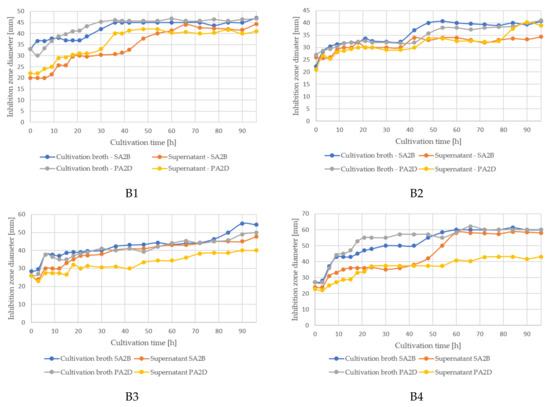 The suppressive effect of cultivation broth samples is primarily attributed to the competitive advantage of the producing microorganism’s cells, while in supernatant, the bioactive components responsible for antifungal activity are extracellular metabolites. The changes in the level of antagonistic activity of cultivation broth samples during the cultivation can be related to the multiplication intensity of the producing isolate, shown in Figure 4, where an evident increase in inhibition zones is recorded during the exponential growth phase. On the other hand, during the stationary growth phase when the secondary metabolism activity of the strain is expressed, there is a slight increase in the inhibition zones obtained by the supernatant samples. The highest antagonistic activity is obtained in the last experimental set, which is also expected according to the previously described results for biomass growth. This fact indicates the importance of the maximization of viable cell numbers at the end of cultivation and in the consequent downstream processing steps, as well as during bioproduct storage, distribution, and application in order to provide the maximal possible biomass content as the active component of the biological product at the application site.