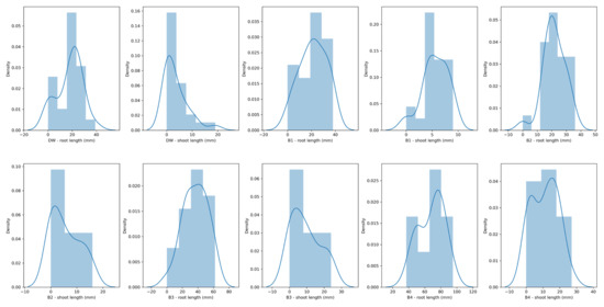 The efficiency of the Bacillus sp. BioSol021 cultivation broth in maize seed germination was assessed for cultivation broth samples obtained in four cultivations under different bioprocess conditions and compared with DW as the negative control. The distribution of the measured values of root and shoot length corresponds to normal distribution, as given in Figure 5.
