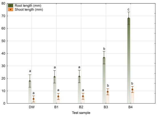 Mean values and standard deviations of root and shoot length, as well as homogenous groups of independent variables according to the Duncan’s multiple range test in terms of effect on maize seed root and shoot length, are given in Figure 6, and they follow the trend presented in Table 5. Namely, they point out significant differences between B3 and B4 grouped at the same level of significance compared with B1 and B2 cultivation broth samples closer to the negative control regarding the effect of maize root and shoot length.