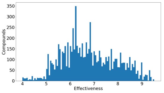 The second data set, which is presented in Table 2, contains compounds that are only LOX-3 inhibitors, i.e., there is no data related to their antioxidant activity. Their activity is measured from a scale of 1 to 10, with measurements being real values. In later tables, we will be calling this activity measurement pChEMBL. Compounds that have an activity value between 1 and 3 have low effectiveness, between 4 and 7 have moderate effectiveness and between 8 and 10 have high effectiveness. This value allows a number of roughly comparable measures of half-maximal response concentration/potency/affinity to be compared on a negative logarithmic scale. For example, an measurement of 1nM would have a pChEMBL value of 9. A histogram presenting the manner by which the compounds are distributed in the data set, depending on their value of activity, can be seen in Figure 1. The numerical features of the compounds are 277 molecular descriptors. Additionally, the annotation of the 24 test compounds is also referred to in the our work [].