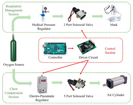 For respiratory management, oxygen from a source was adjusted to appropriate pressure through the medical oxygen regulator. The driver circuit was instructed by the controller to adjust the on–off of the 3-port solenoid valve to provide the appropriate pressure of oxygen at the required point in time.