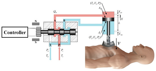 Figure 3 shows the kinetic model of the power mechanism, where T is temperature; P is pressure; V is volume; X is piston displacement in the positive direction of extension; L is piston stroke; P1, V1, and T1 are rodless chamber parameters; P2, V2, and T2 are rodded chamber parameters; Ps and Ts are gas source parameters; Pa and Ta are ambiance parameters; A1 and A2 are the action area of the piston on the rodless and rodded chamber sides, respectively; and X10 and X20 are the equivalent lengths of the initial volumes of the rodless and rodded cavities, respectively.