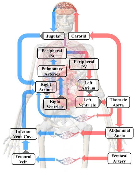 The human blood circulation system is a complex nonlinear system, and to study it quantitatively, we carried out our analysis based on [33]. The human body can be idealized into 14 chambers as shown in Figure 5, in which the blocks represent different chambers and the gray triangles represent valves between chambers.