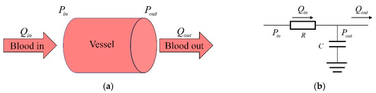 where C is the compliance, is the volume change, and is the pressure change. During the flow of blood, the flow impedance and compliance given by the blood vessel are similar to the resistance and capacitance characteristics in a circuit, so vessels (Figure 6a) can be abstracted as circuits (Figure 6b).