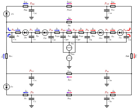 In Figure 7, all chambers are represented by resistance and capacitance, respectively, and the unidirectional flow of the human valve is characterized by a diode. The arrows in Figure 7 indicate blood flow, where red arrows are arterial blood and blue arrows are venous blood.