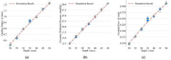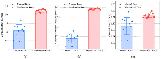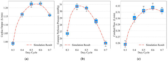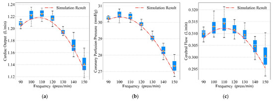 After obtaining the compression waveforms under various conditions, we chose to use the cardiac output (CO) [34], coronary perfusion pressure (CPP) [3,4,35], and cerebral flow (CF) [36,37] as the criteria for evaluating the blood circulation effect. CO calculates the blood flow pumped out of the heart per minute, CPP calculates the pressure gradient between the aorta and the right atrium during the diastolic period, and CF calculates the blood flow of the brain per minute.